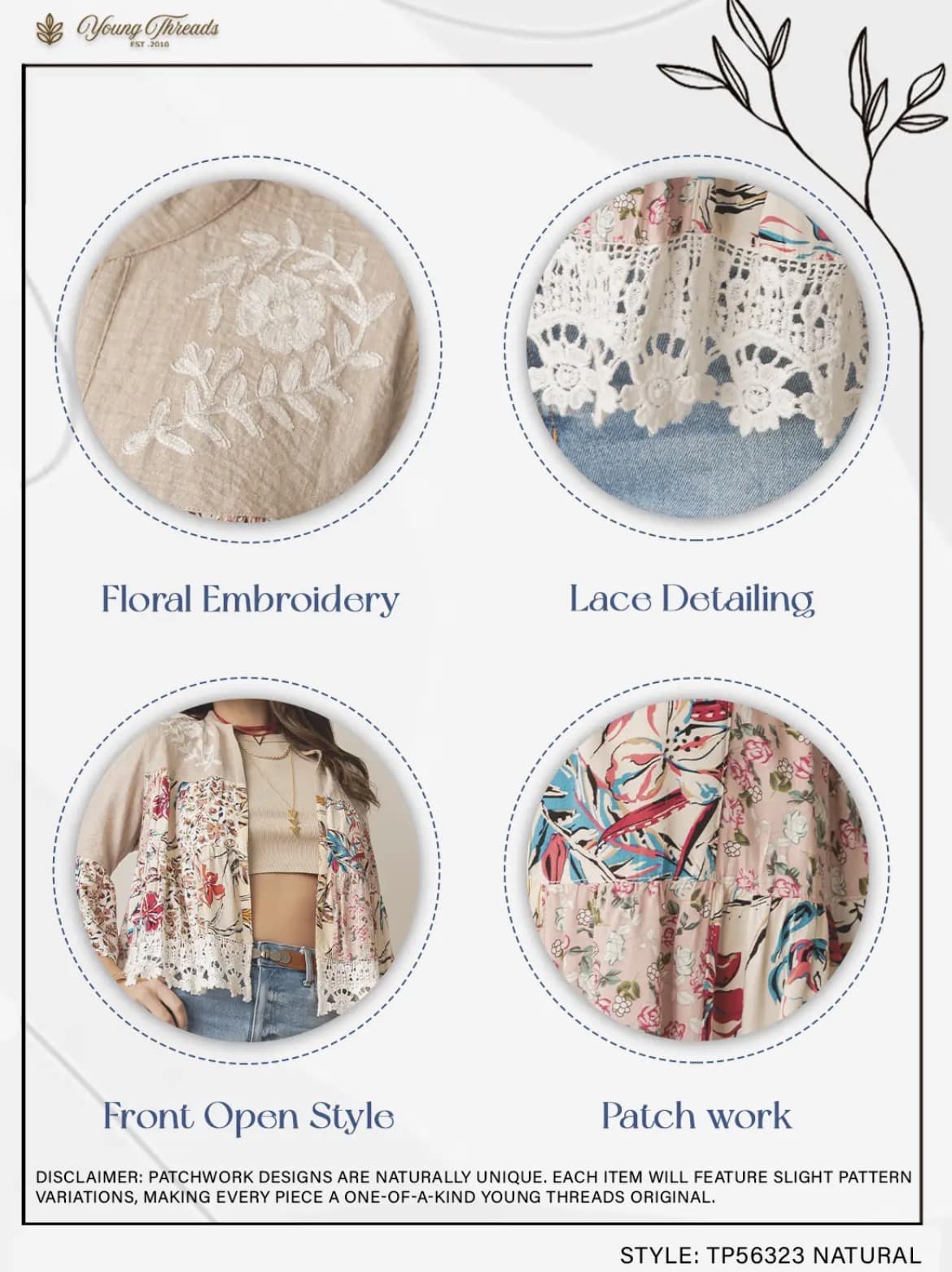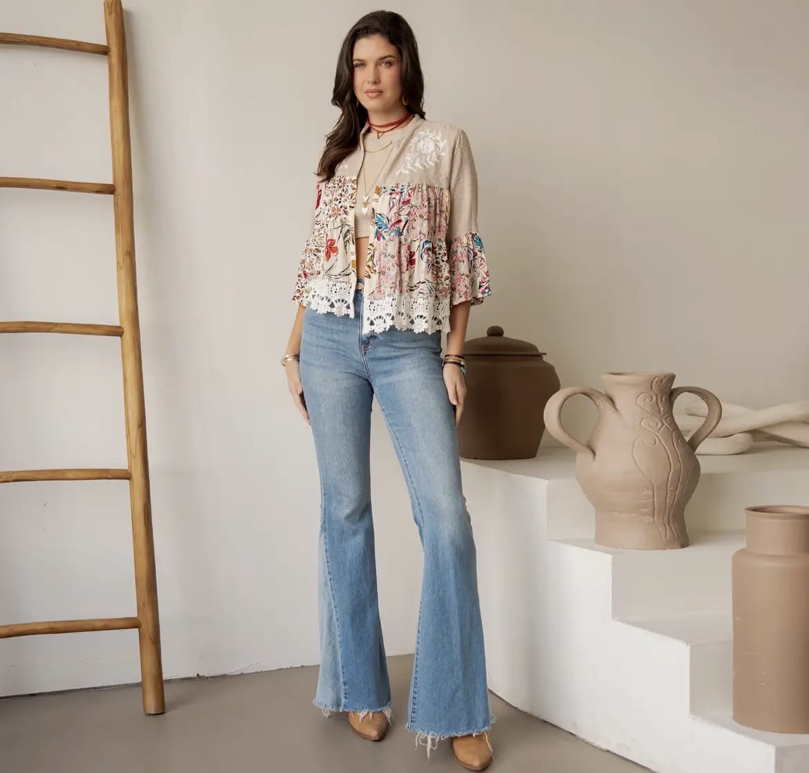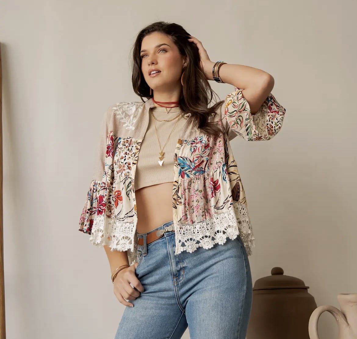 The Boho Garden Shrug features intricate lace details and a floral-inspired design, offering versatile layering options for any outfit. Finished with a delicate lace trim, it adds a touch of bohemian elegance.