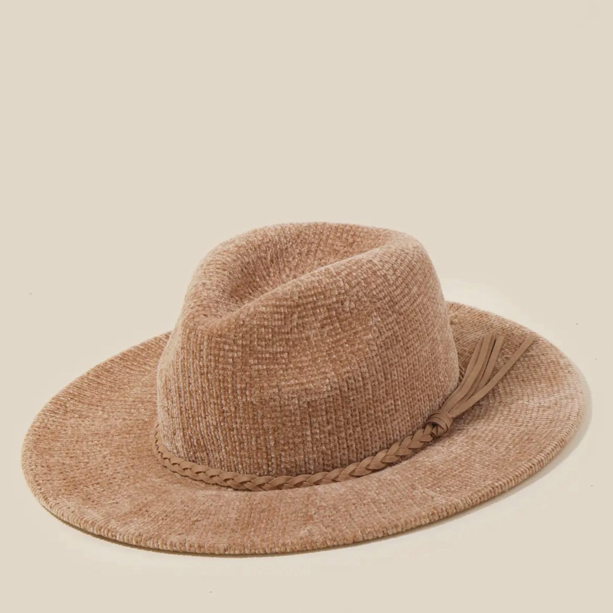 Crafted from soft chenille material, this classic Panama hat combines timeless style with comfort. A versatile accessory perfect for any occasion.