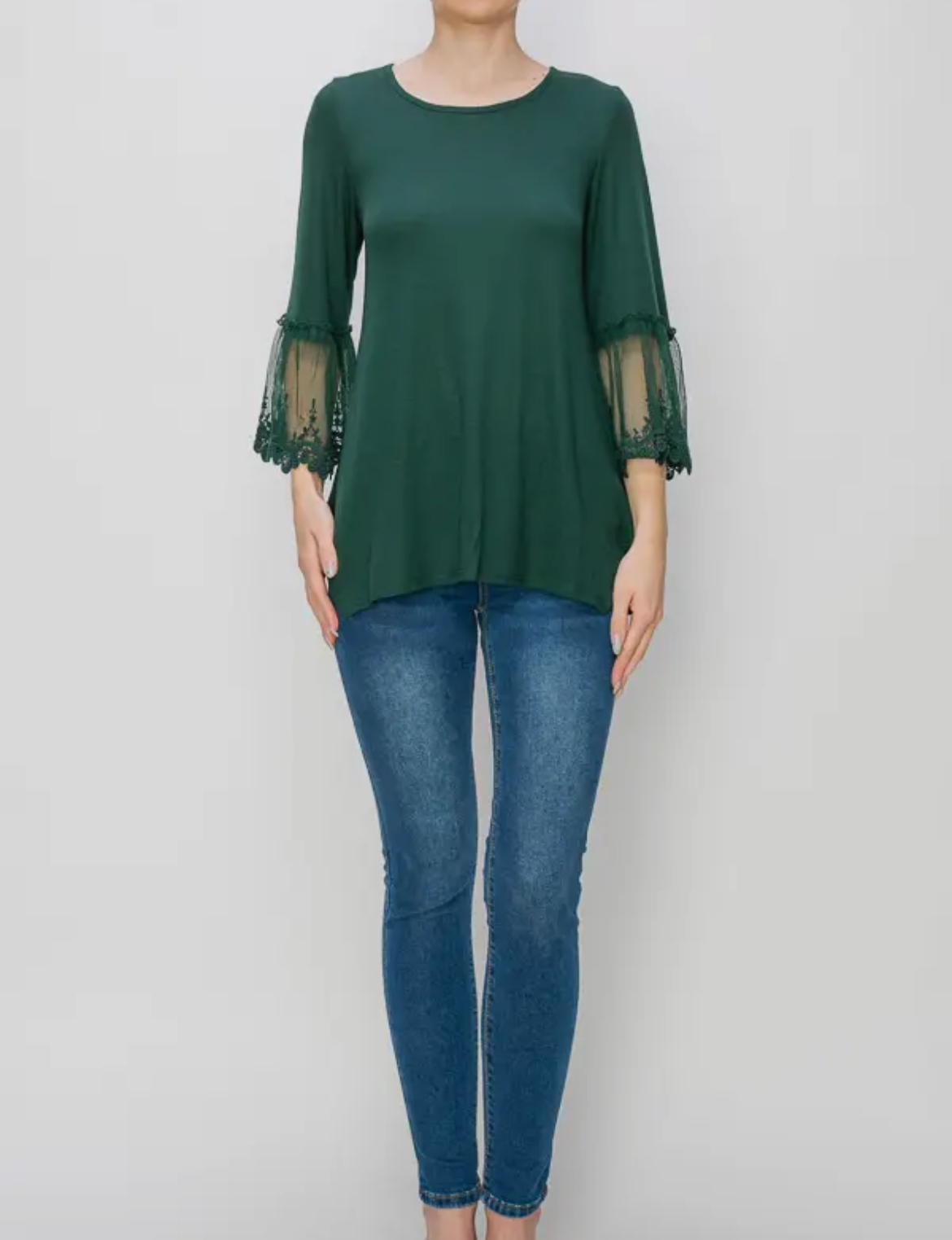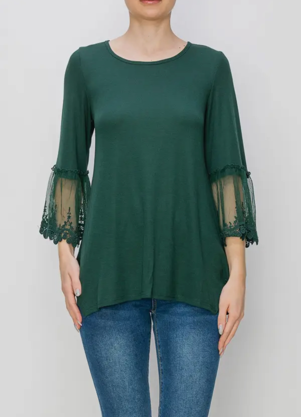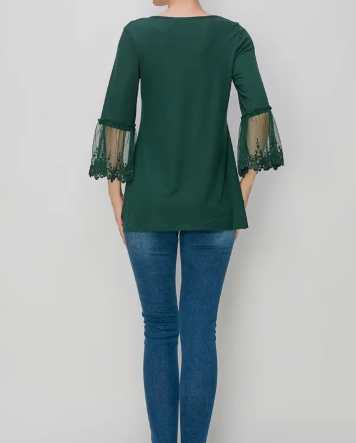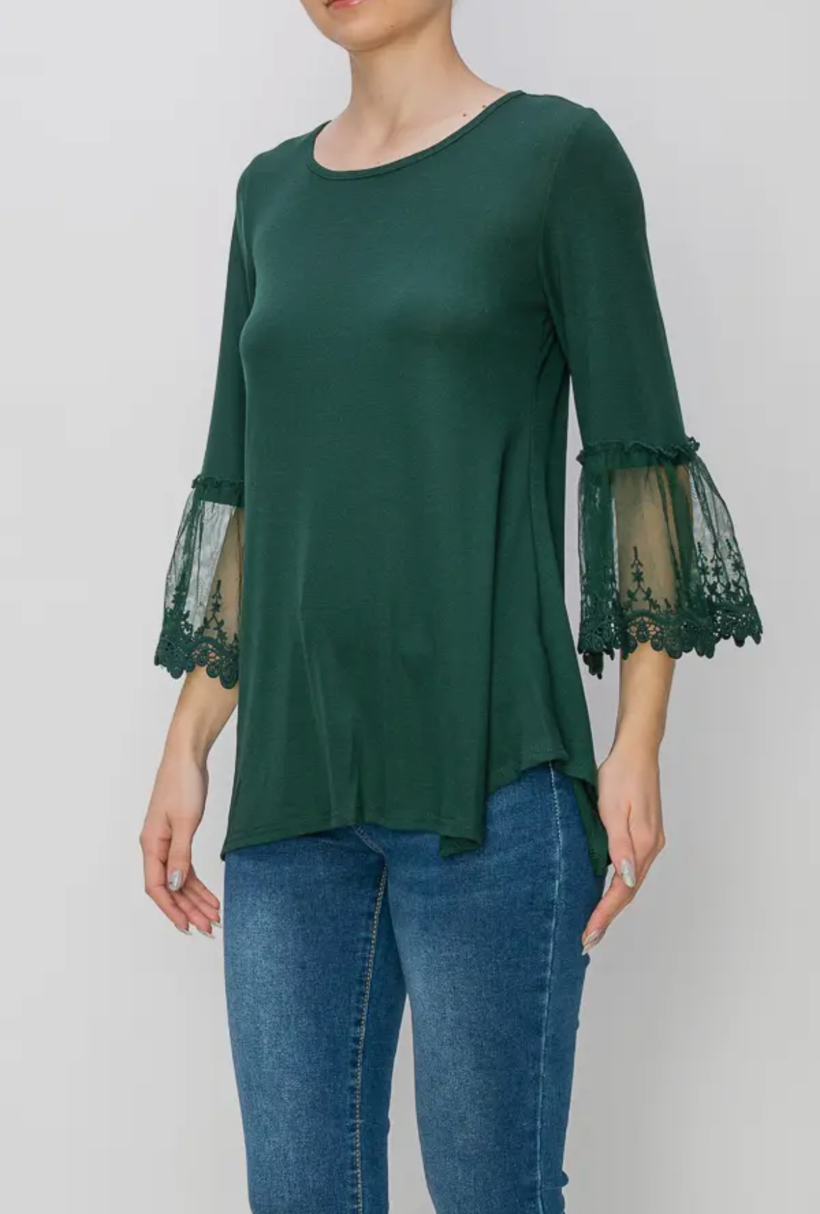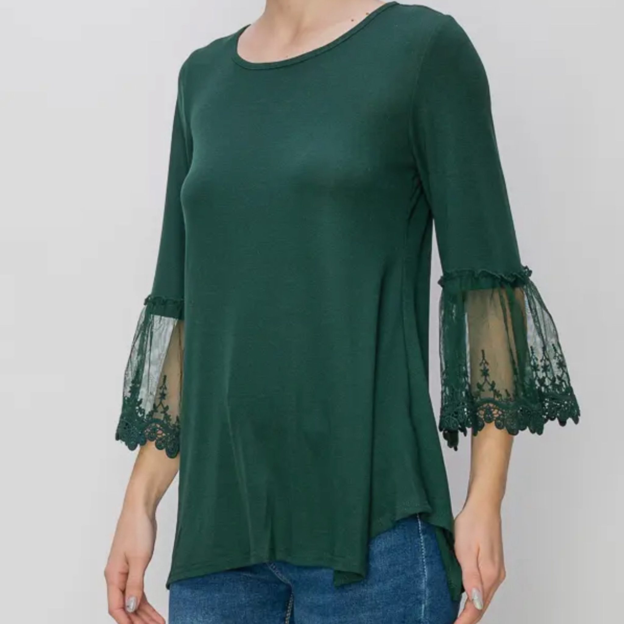 Made from soft cotton fabric, the Cotton & Lace Top in vibrant emerald features elegant lace bell sleeves, offering a stylish and comfortable addition to your wardrobe.