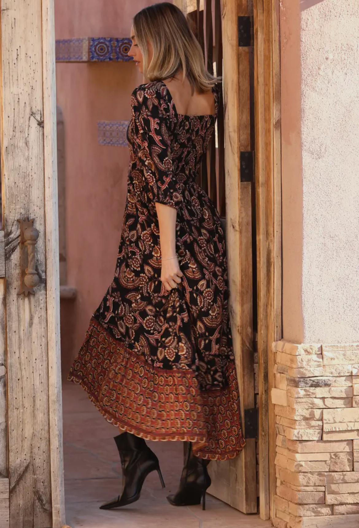 The Crimson Forest Dress features bold fall colors, a twist peekaboo design, and a flowing silhouette. Intricate floral patterns add a touch of elegance to this versatile seasonal piece.