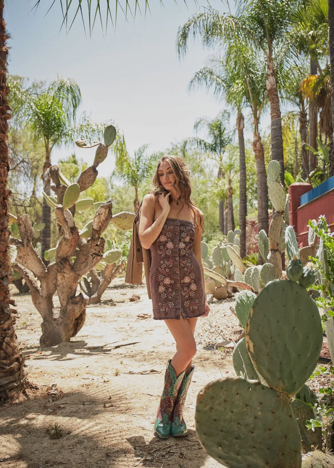 The Danika Denim Dress features a classic tube silhouette crafted from durable denim, accented with delicate embroidered flower designs for a touch of elegance.