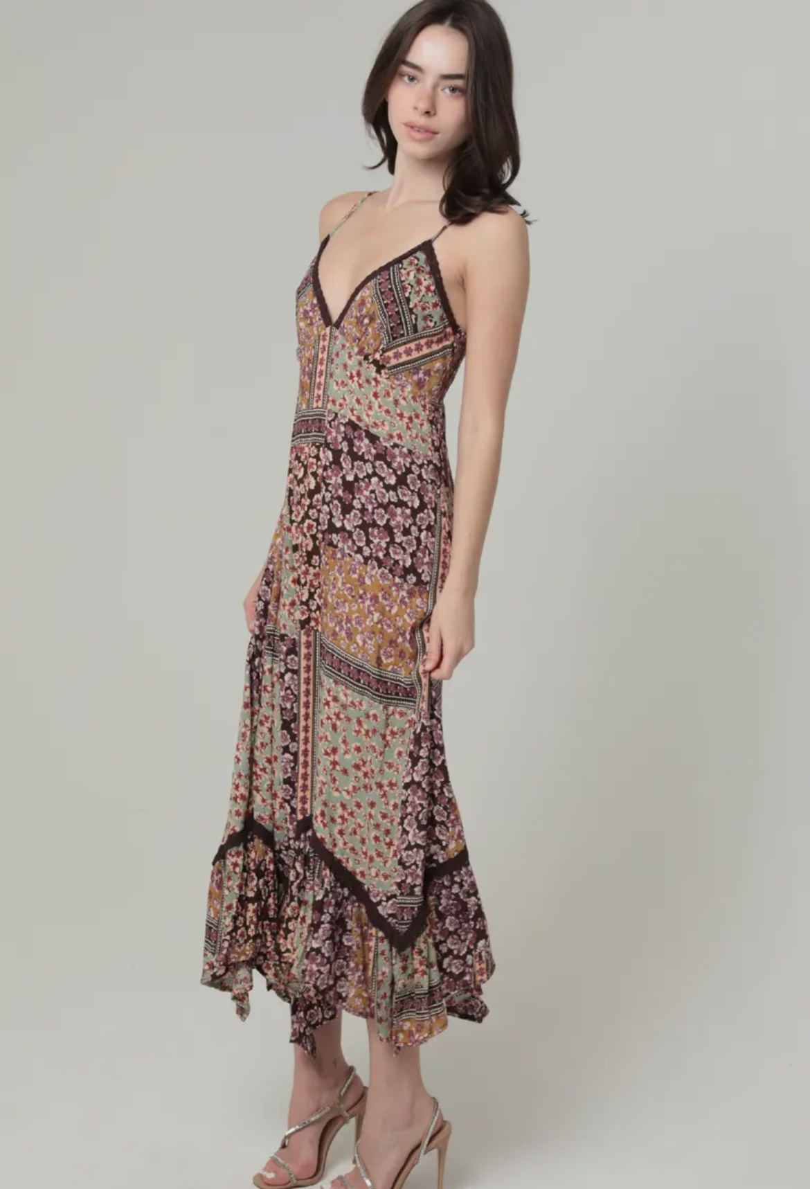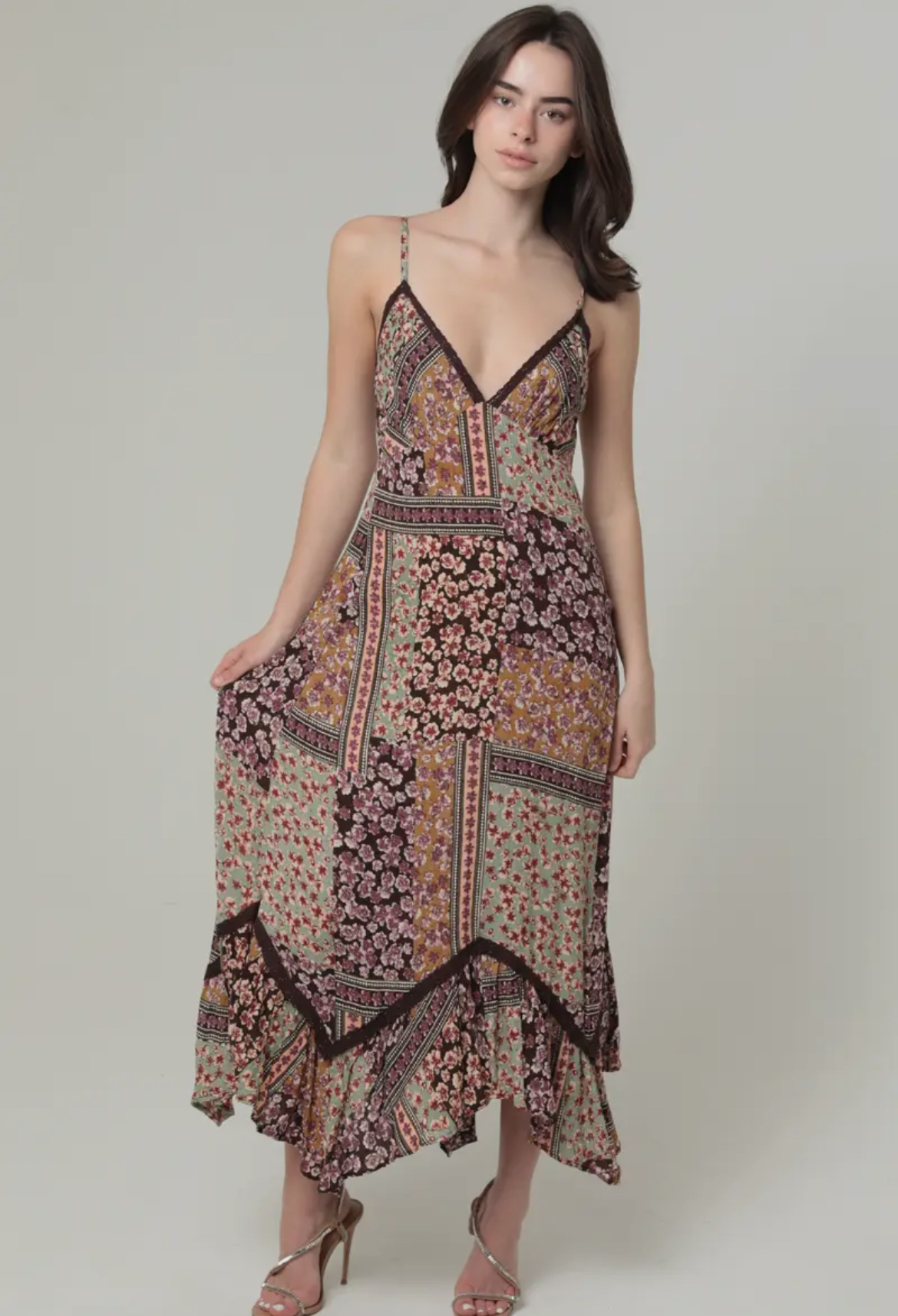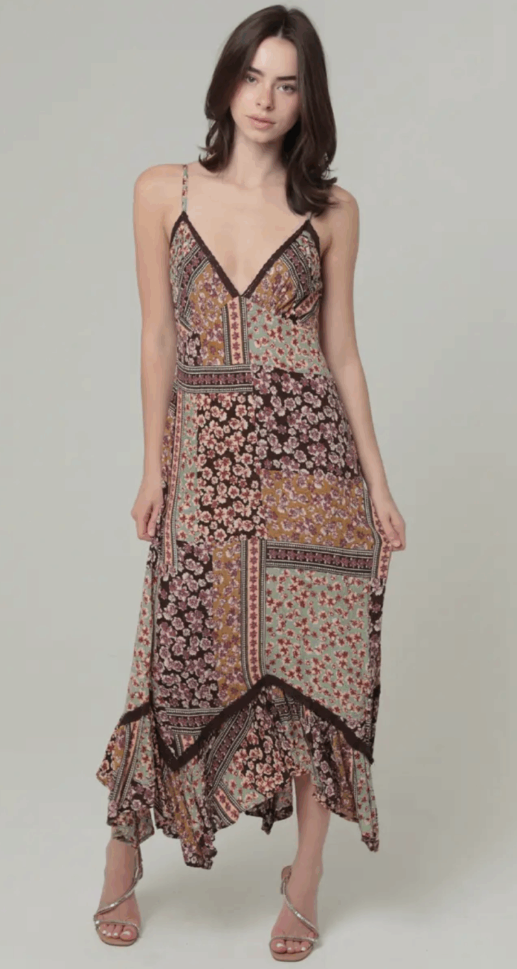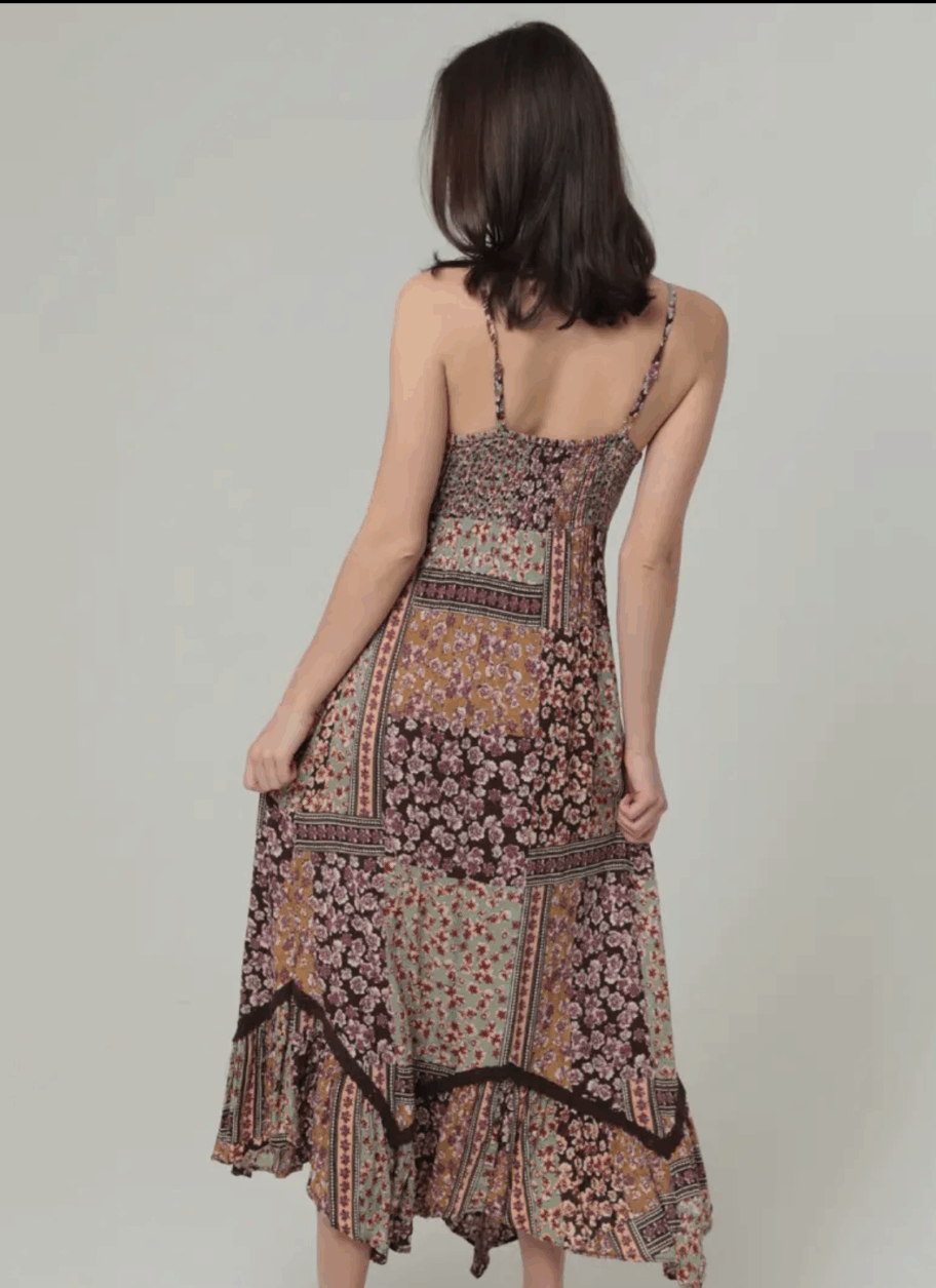 The Floral Forest Dress features a botanical print and a flowy silhouette, embodying effortless boho style. Its versatile design makes it suitable for various occasions.