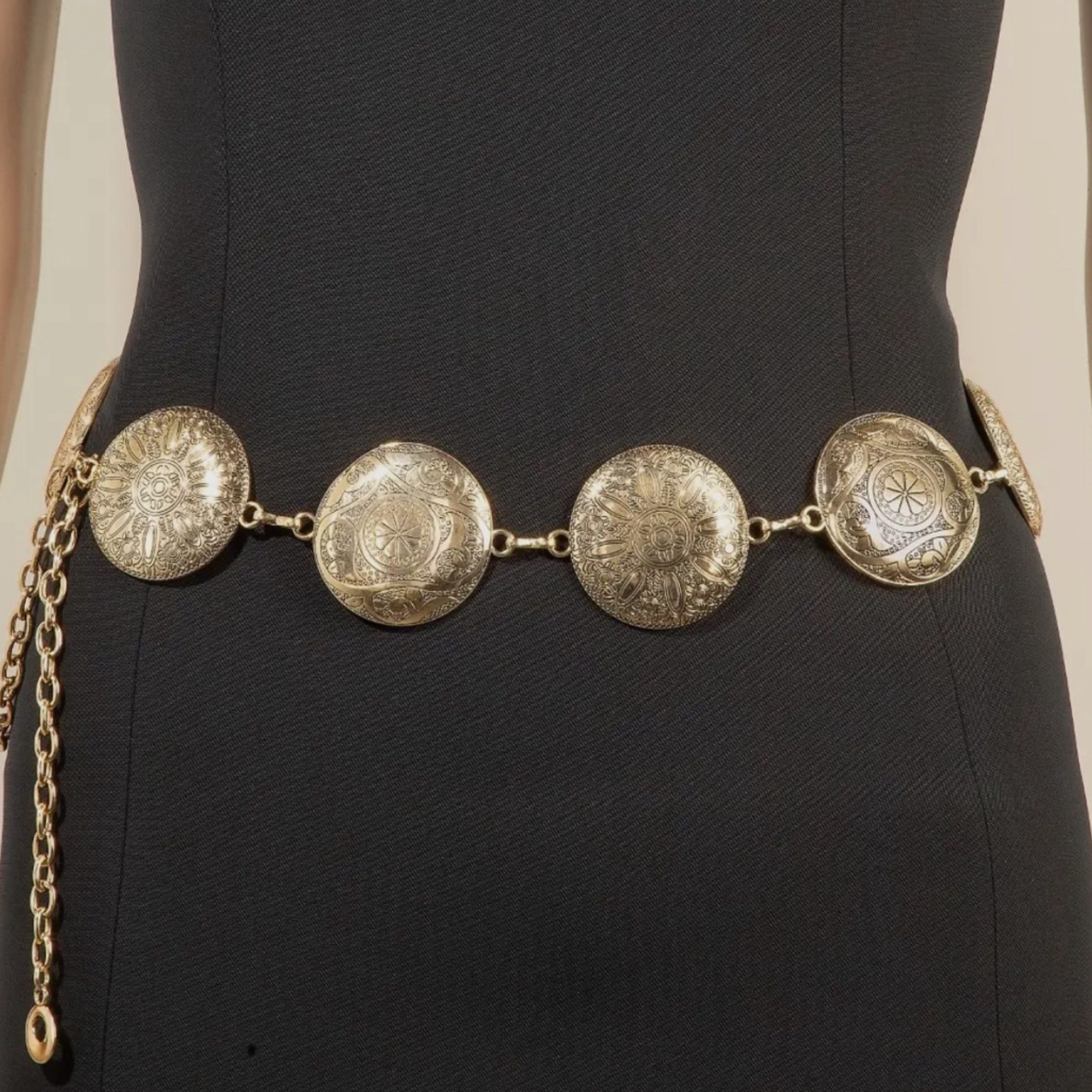 The Gold Concho Belt features a bohemian-inspired design it offers a versatile accessory for both waist and hip styling. Its timeless aesthetic complements free-spirited and modern looks alike.