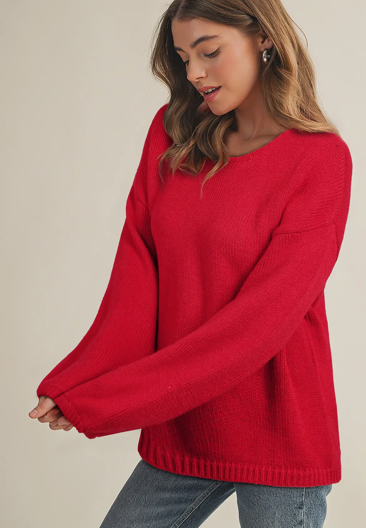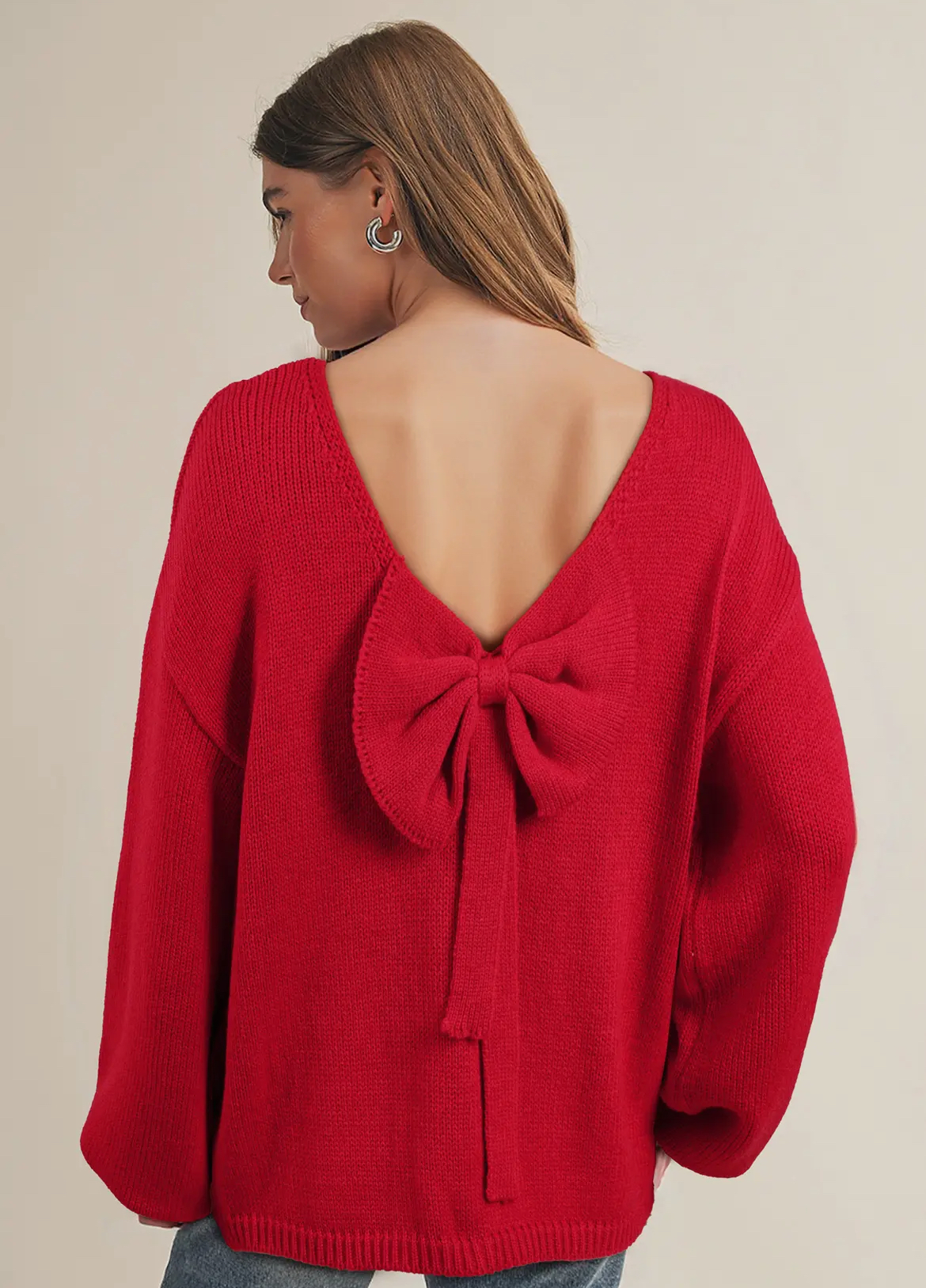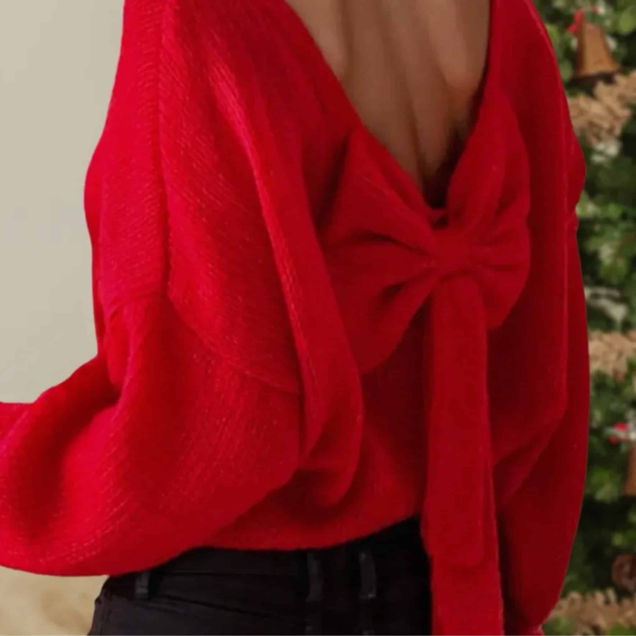 The Holly Jolly Sweater combines festive charm with a cozy feel, featuring a low back and a decorative bow for a unique holiday look. Perfect for embracing the holiday spirit in comfort and style.