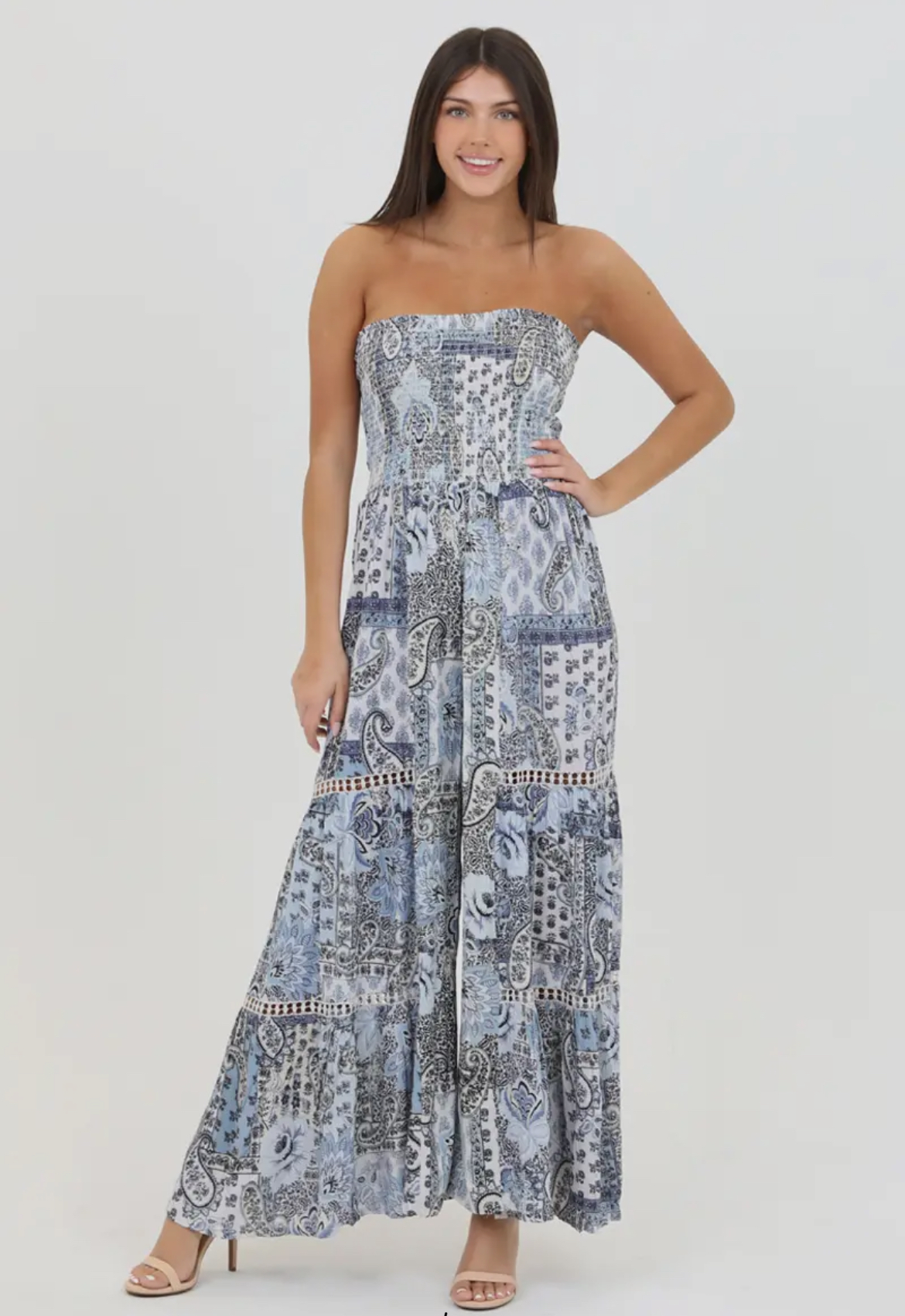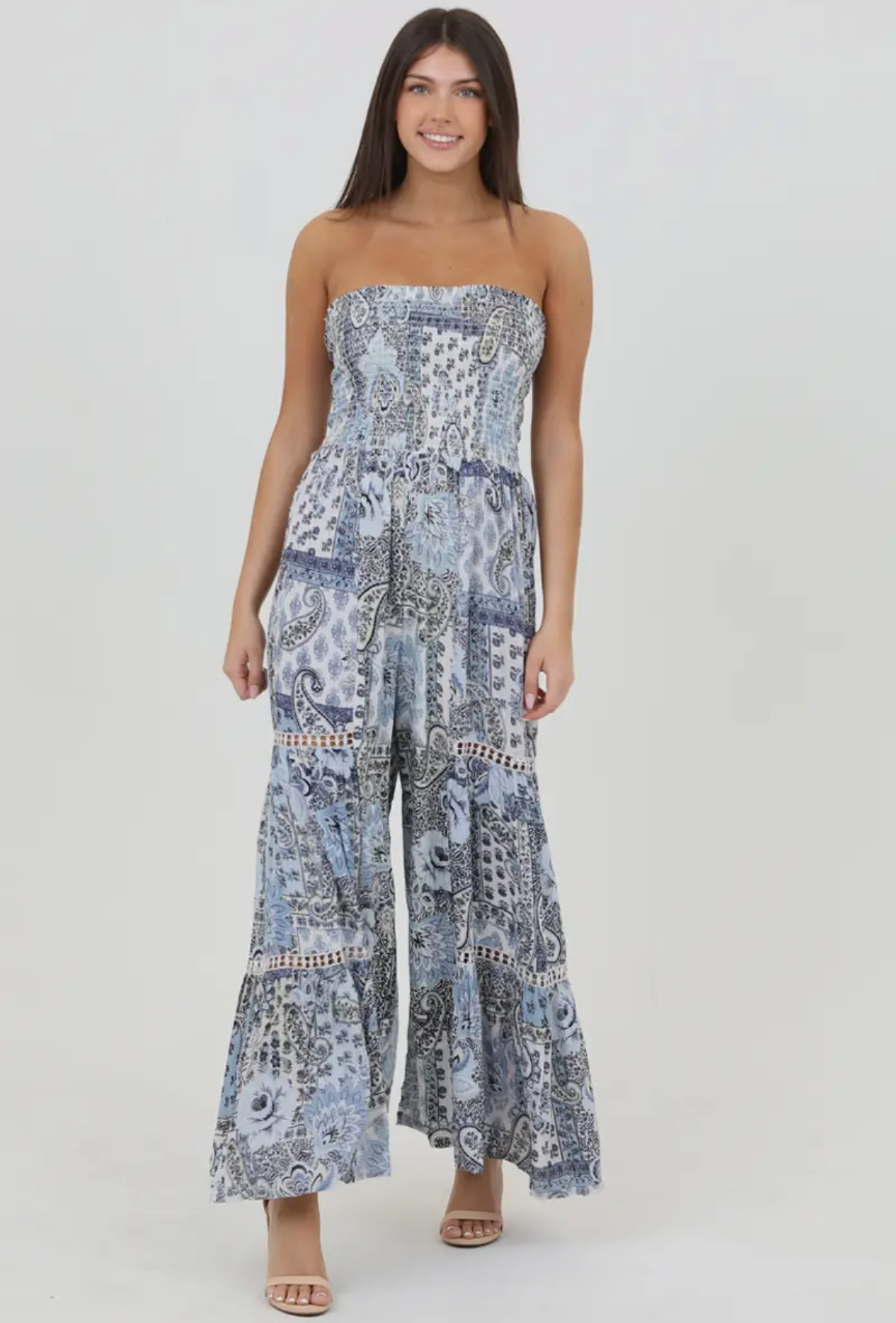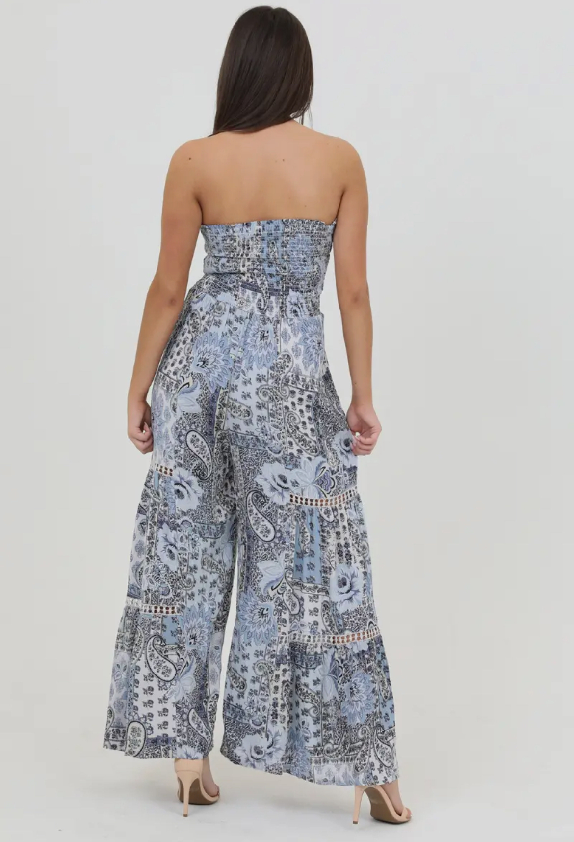 Discover the perfect blend of style and comfort with our Paisley Jumpsuit. Featuring a stylish smocked bodice, wide legs, and delicate lace details, this versatile outfit is a must-have for fashion-forward individuals. Elevate your wardrobe with this chic jumpsuit today!