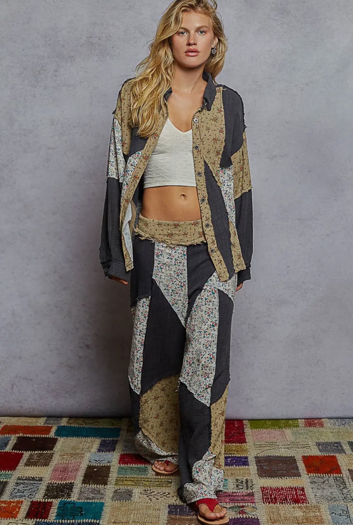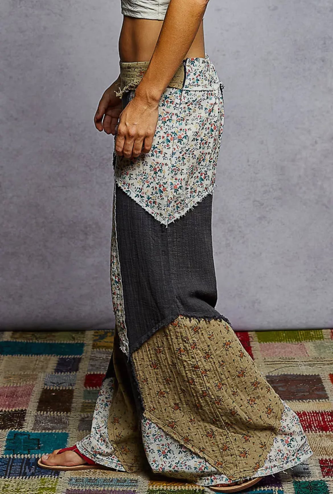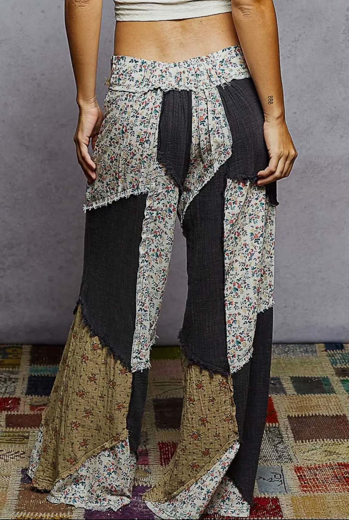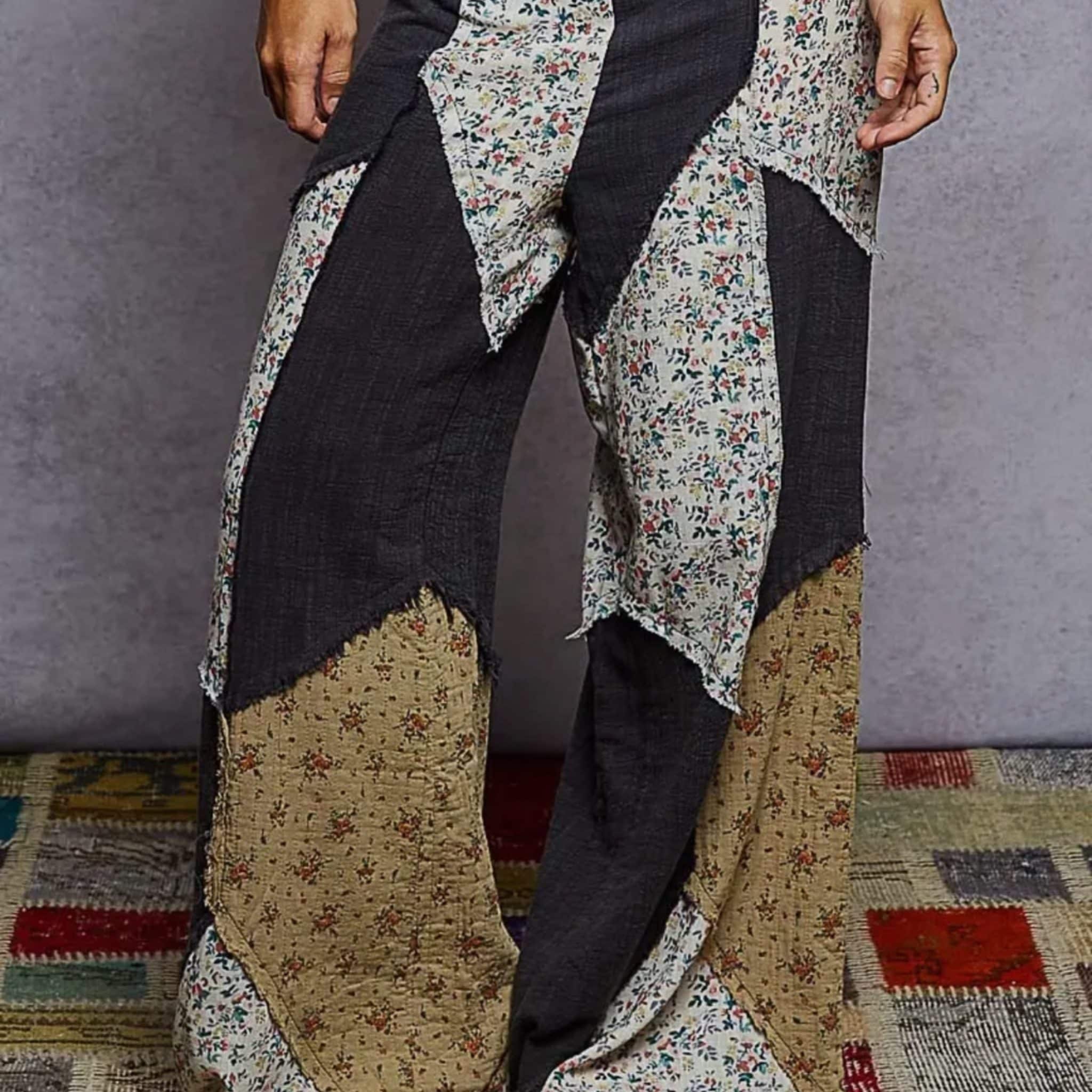 Patchwork Wide Leg Pants crafted with quality soft fabric for a comfortable fit. Features a unique design and versatile style suitable for various occasions.